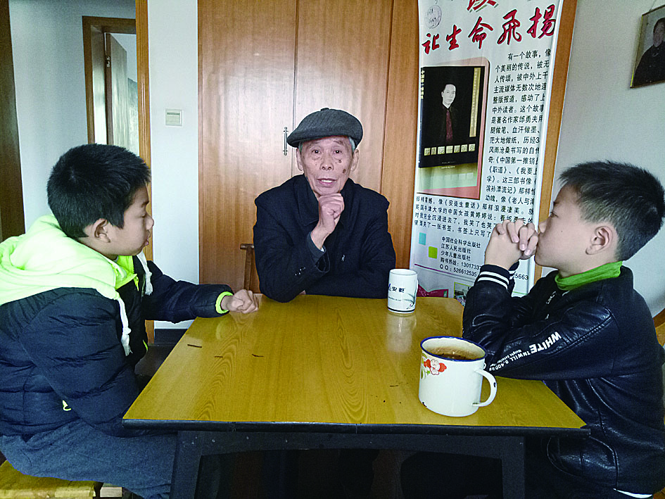 孩子们纷纷表示,一定会珍惜现在的幸福生活,好好学习,为建设更强大的祖国献一份力。图为黄明山老人为孩子讲故事。