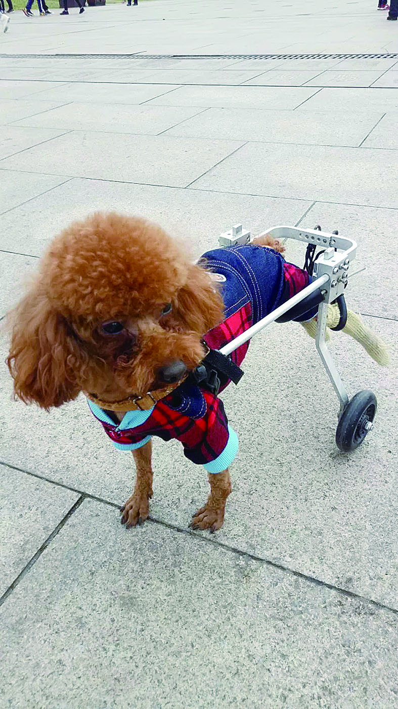 由于迪迪大小便不能自行排出,要人工操作,如果没有专人照顾就活不下去,志愿者们决定轮流照顾它。大家还买来宠物轮椅给它装上,让它行走自如。