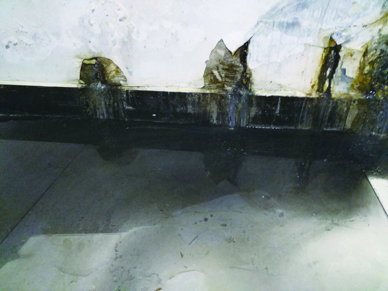 昨日上午,记者来到现场看到,该门面位于东鼎紫园1、2栋一楼临街,有一座楼梯连通到地下一层,位于楼梯底部的墙角渗水很明显,有黑色的污水渗出,地上积水明显,并散发出刺鼻的异味。