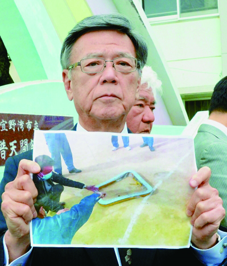 ▲13日,日本宜野湾,冲绳县知事翁长雄志展示美军直升机坠物的照片