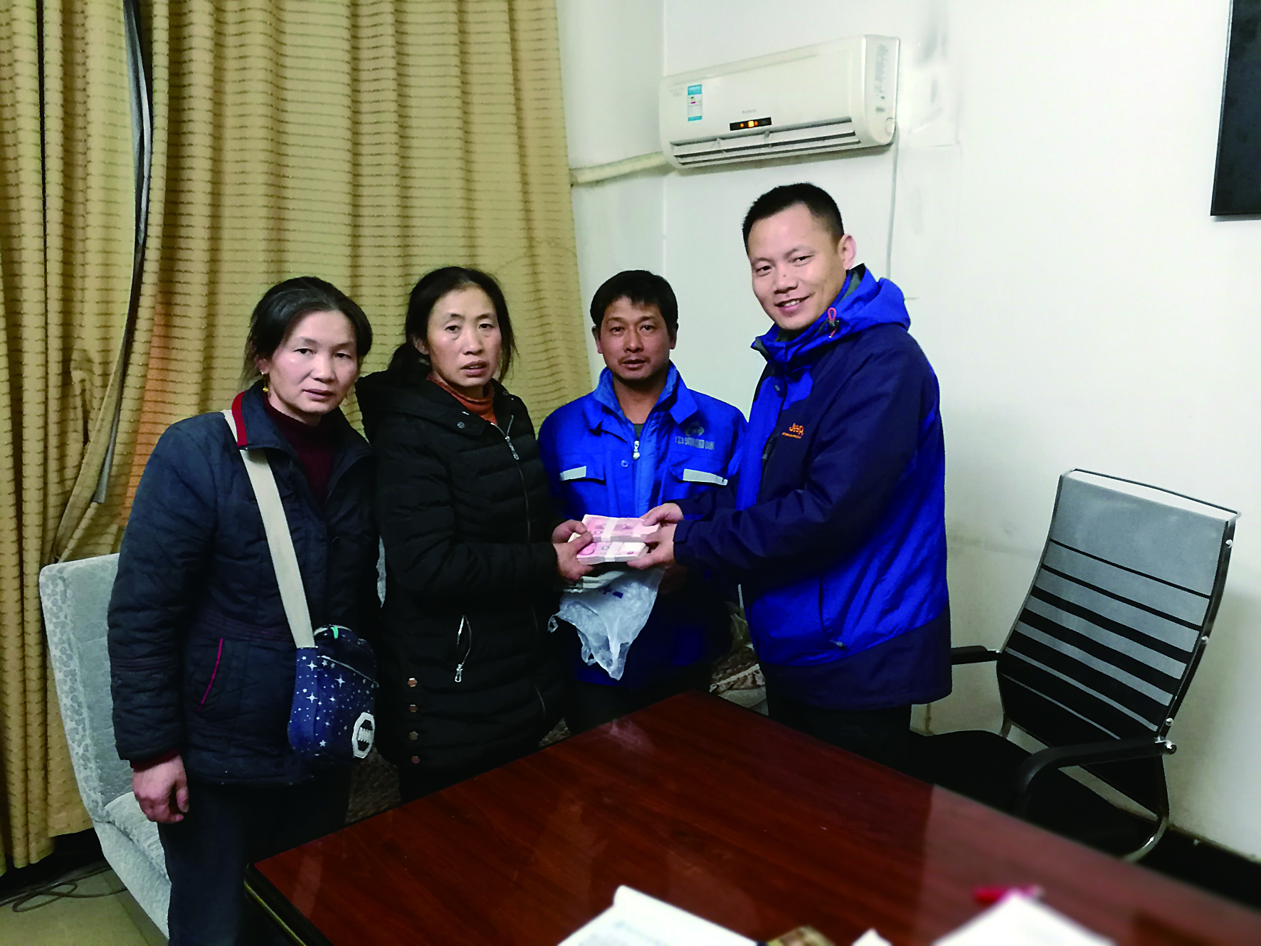 ▲公交工作人员袁福德(右1)将钱交还谭女士(左2) 通讯员供图