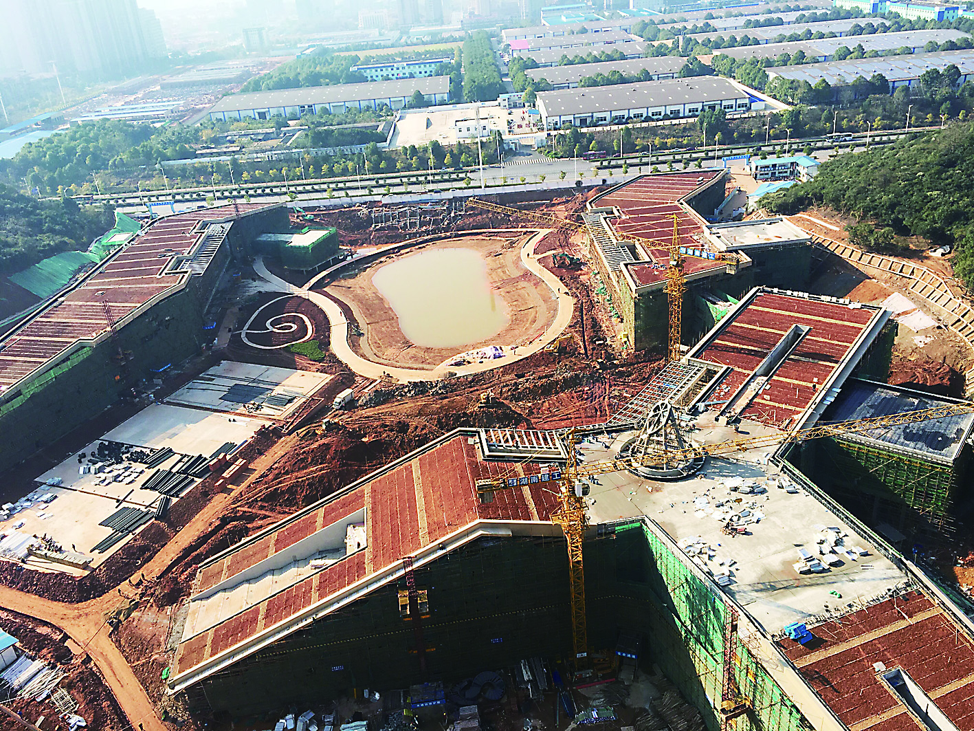 ▲昨天拍摄的“三个中心”建设工地,其主要建筑已经基本完工 记者 刘娟 摄