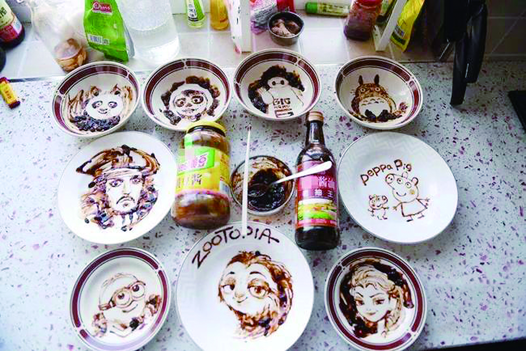 原因是她用黄豆酱和老抽做颜料,用勺子、筷子做画笔,用盘子做画板,画出很多卡通人物。功夫熊猫、小猪佩奇、小黄人……应有尽有。