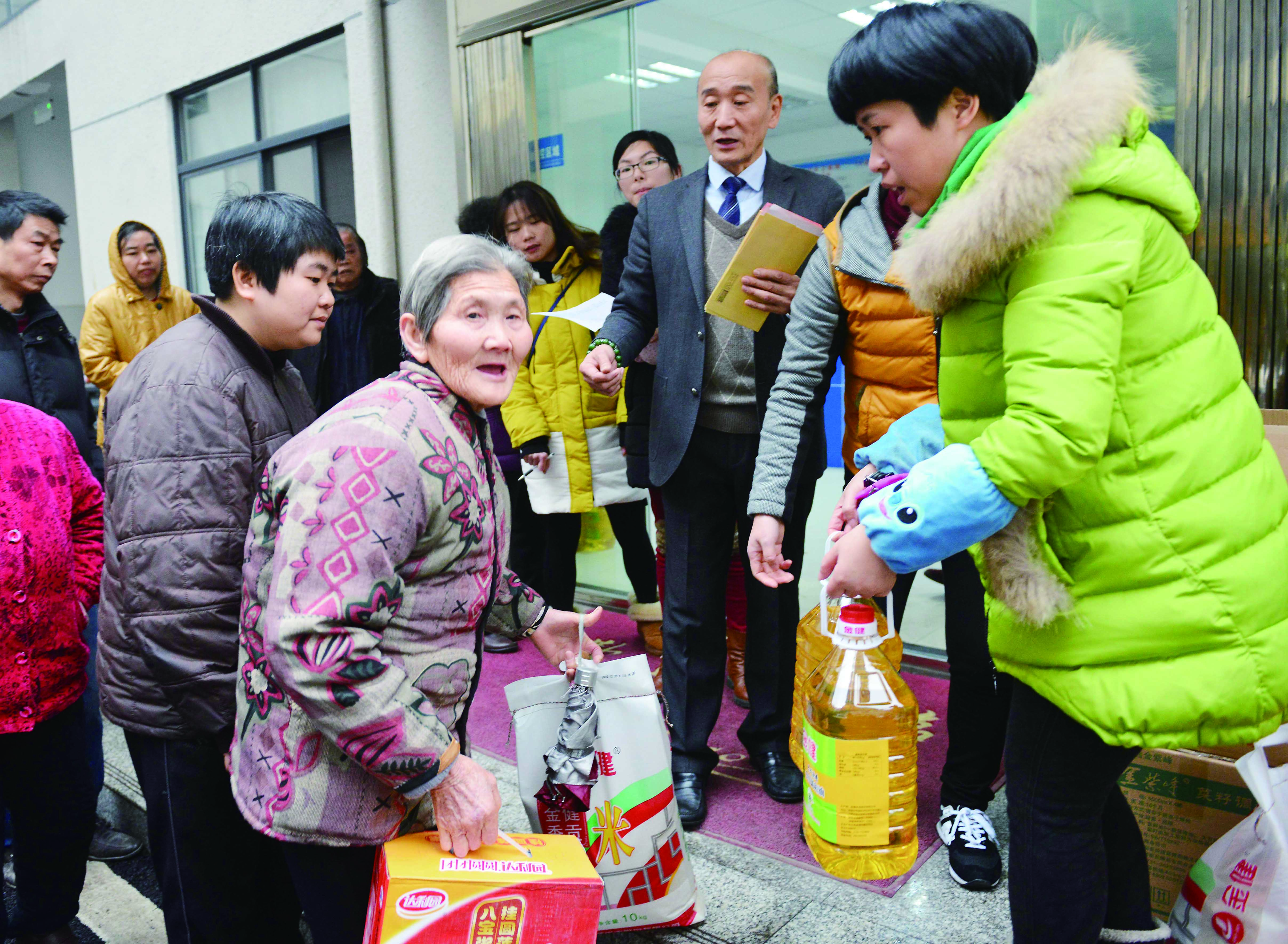 ▲往年为特困群众送年货现场(资料图) 记者 谢慧 摄