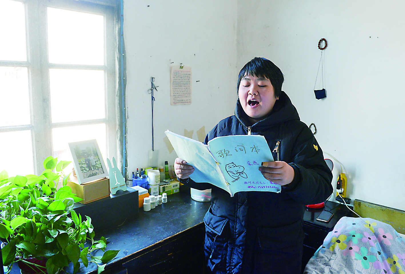 ▲袁艳最大的爱好是唱歌,她拿着好心人帮她记下的歌词本,一展歌喉