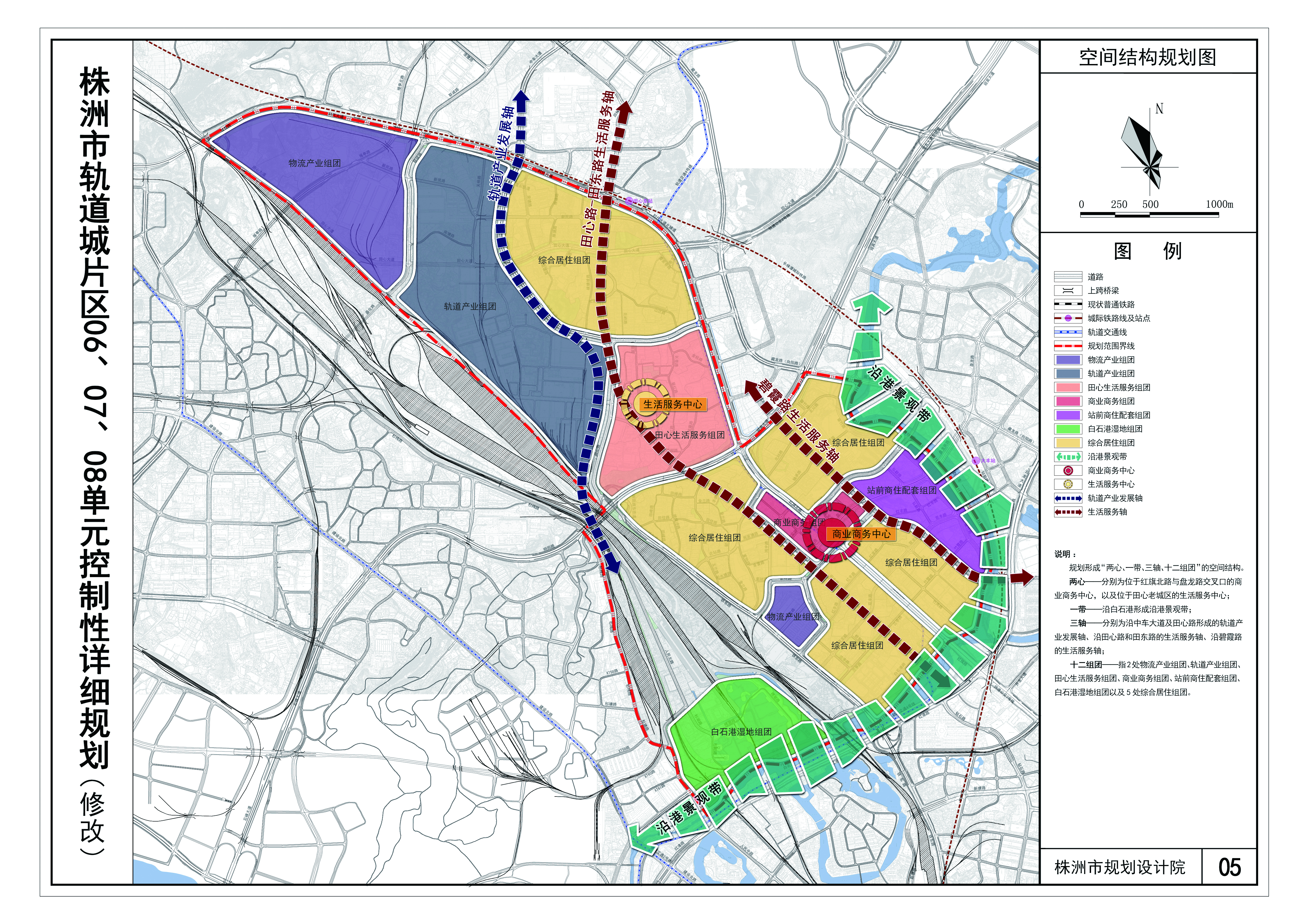 “三轴”则分别是沿中车大道及田心路形成的轨道产业发展轴、沿田心路和田东路形成的生活服务轴、沿碧霞路形成的生活服务轴。