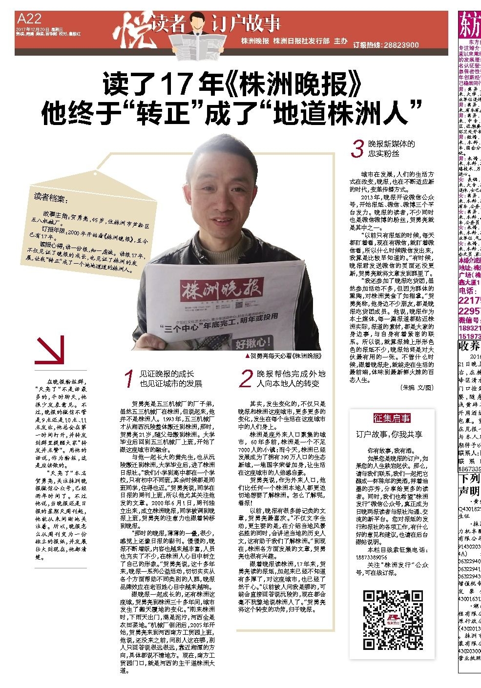 订报年限:2000年开始看《株洲晚报》,至今已有17年。