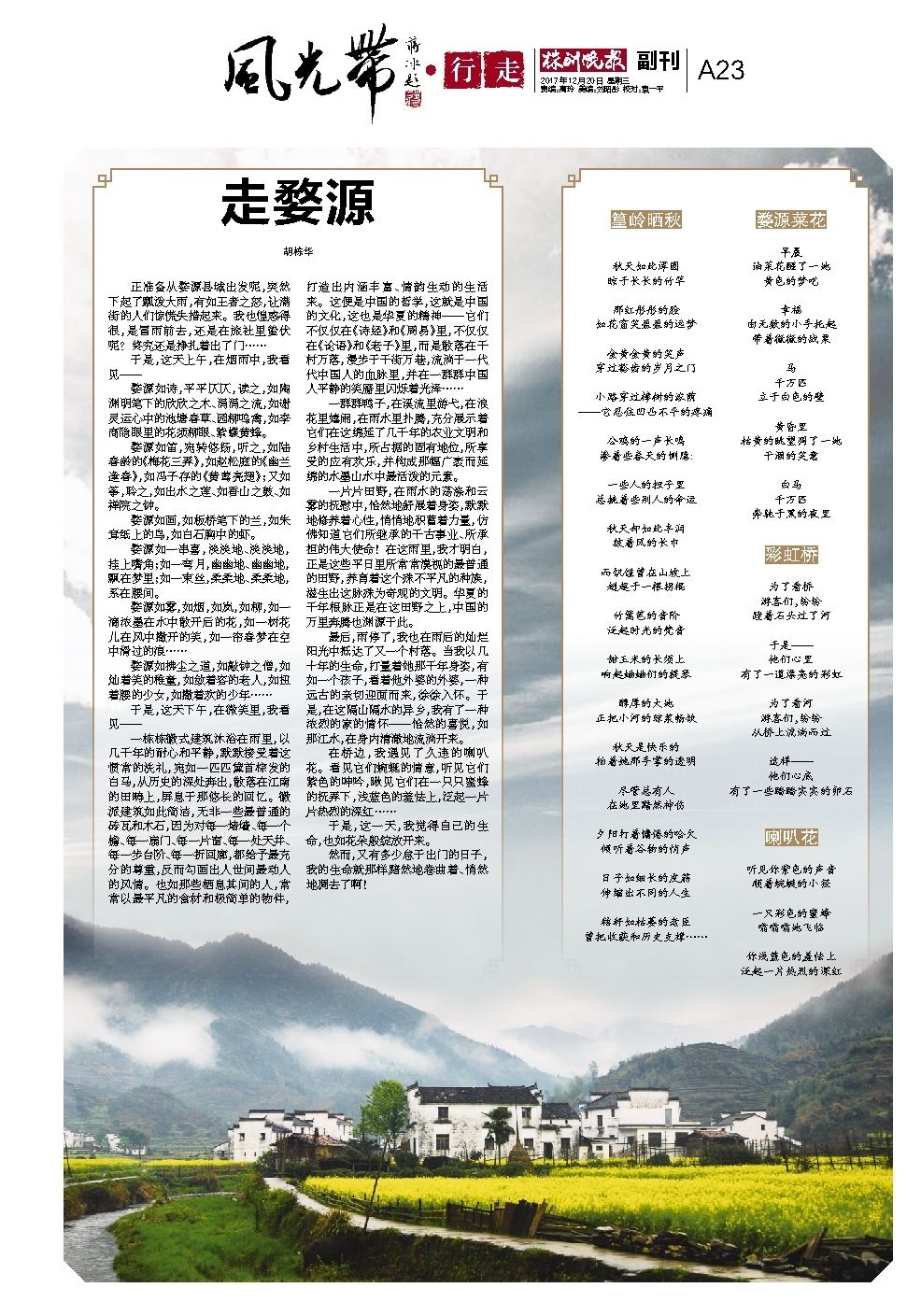 婺源如诗,平平仄仄,读之,如陶渊明笔下的欣欣之木、涓涓之流,如谢灵运心中的池塘春草、园柳呜禽,如李商隐眼里的花须柳眼、紫蝶黄蜂。