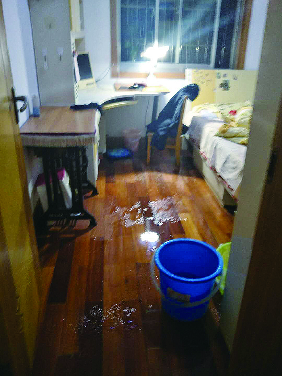 住在楼下的王女士说,当晚,她家每一个房间都在漏水,地板、墙面、床上用品、衣物等均有不同程度的受损。