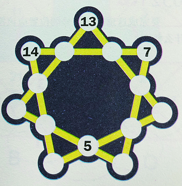 将数字1-14填入以下七角星的圆圈内,使每条直线上数字之和为30,你要试试吗?