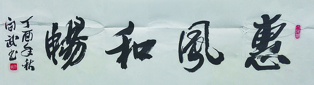 “惠风和畅”出自于王羲之《兰亭集序》:“是日也,天朗气清,惠风和畅。仰观宇宙之大,俯察品类之盛,所以游目骋怀,足以极视听之娱,信可乐也。” (作者:黎向武 82岁 石峰区北峰村)