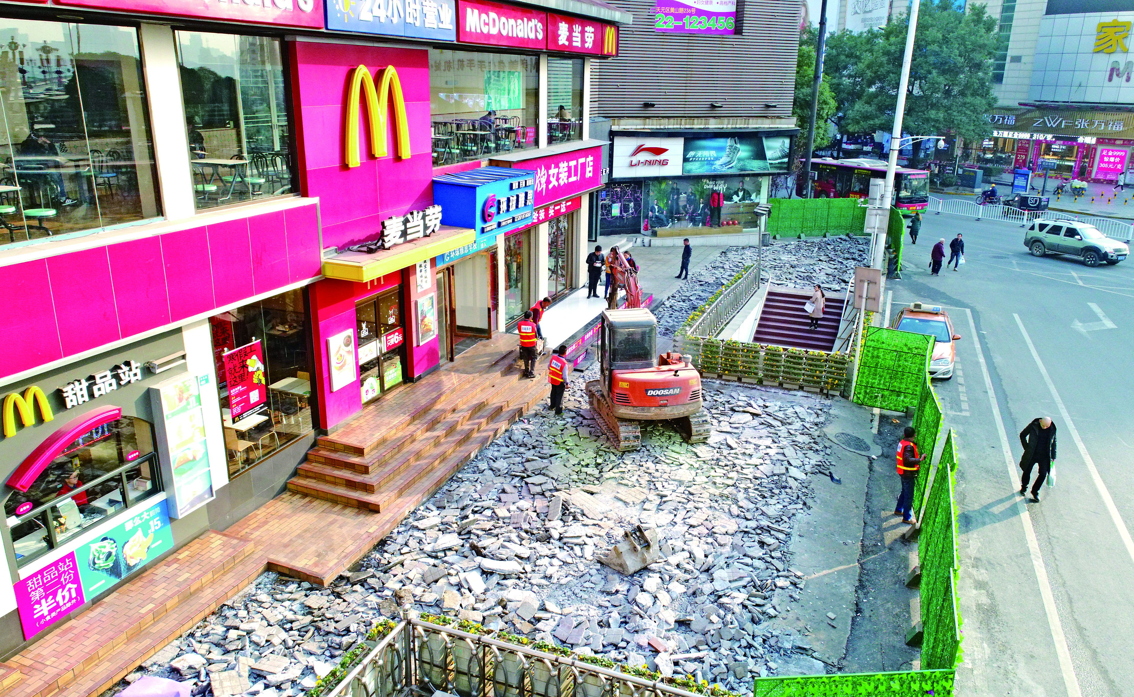 昨天,中心广场东南角(靠近麦当劳餐厅)被围挡遮住,围挡内的行道砖都被刨开,不少从地下通道出来的市民都看着好奇:为何突然修这里?