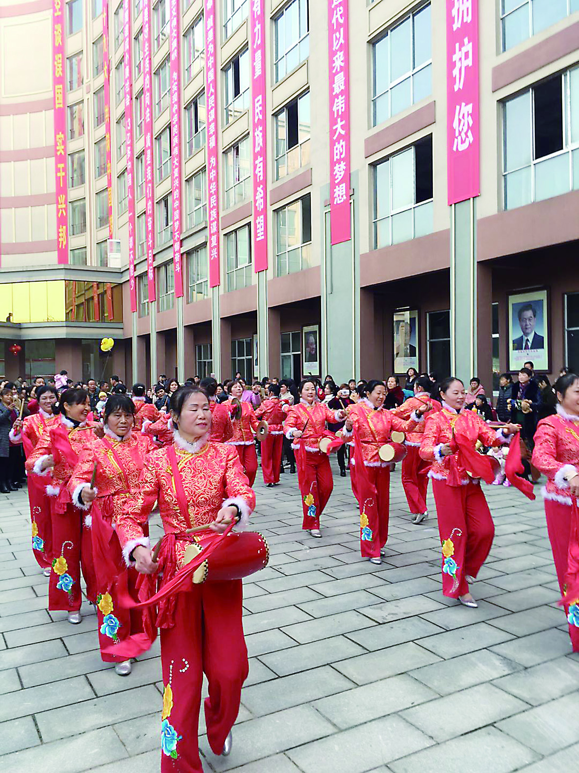 活动纪念仪式后,村民们自编自演的广场舞、独奏、武术等精彩节目逐一登台亮相。中午,百余张圆桌整齐摆放,主食是热气腾腾的长寿面。村民们围坐在桌前,边吃边聊着家长里短。