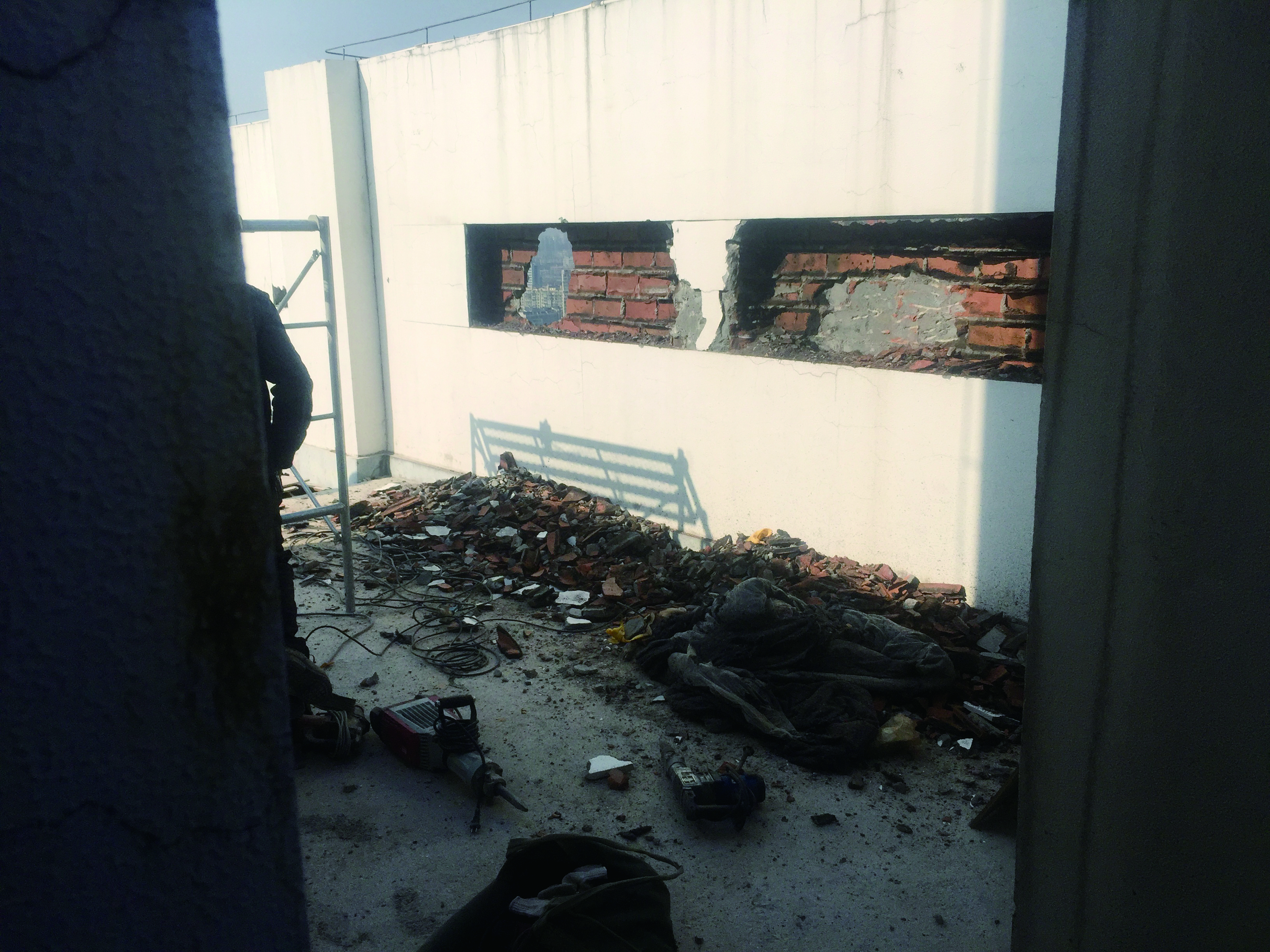 昨天下午,记者再次来到山水国际7栋顶楼看到,顶层的外墙上已经画好了许多“方格子”,并且有一些“方格子”已经被凿穿,现场施工人员正在对墙面进行切割。