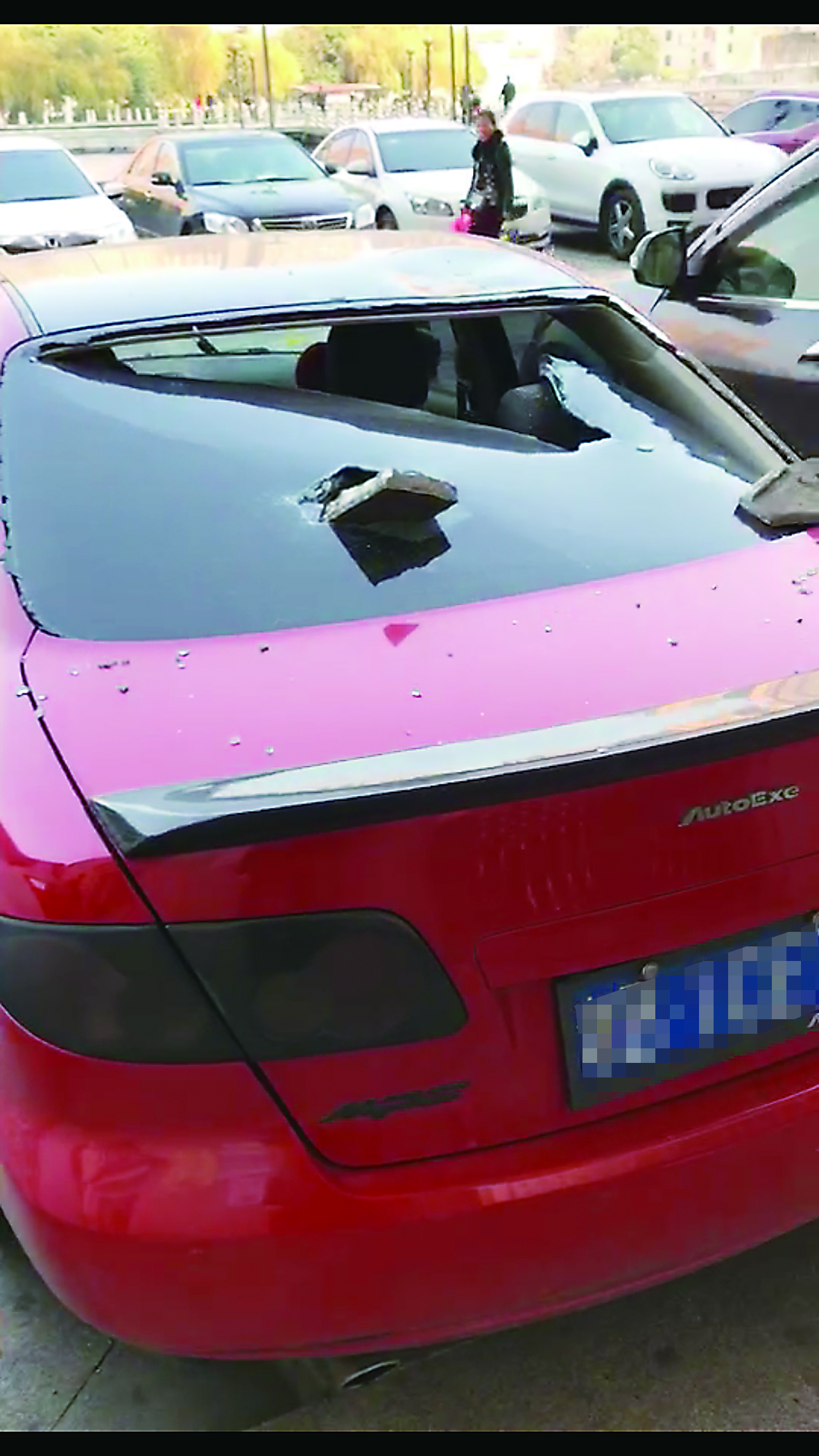 ▲汤先生的车后窗被砸碎,车顶受损 受访者供图