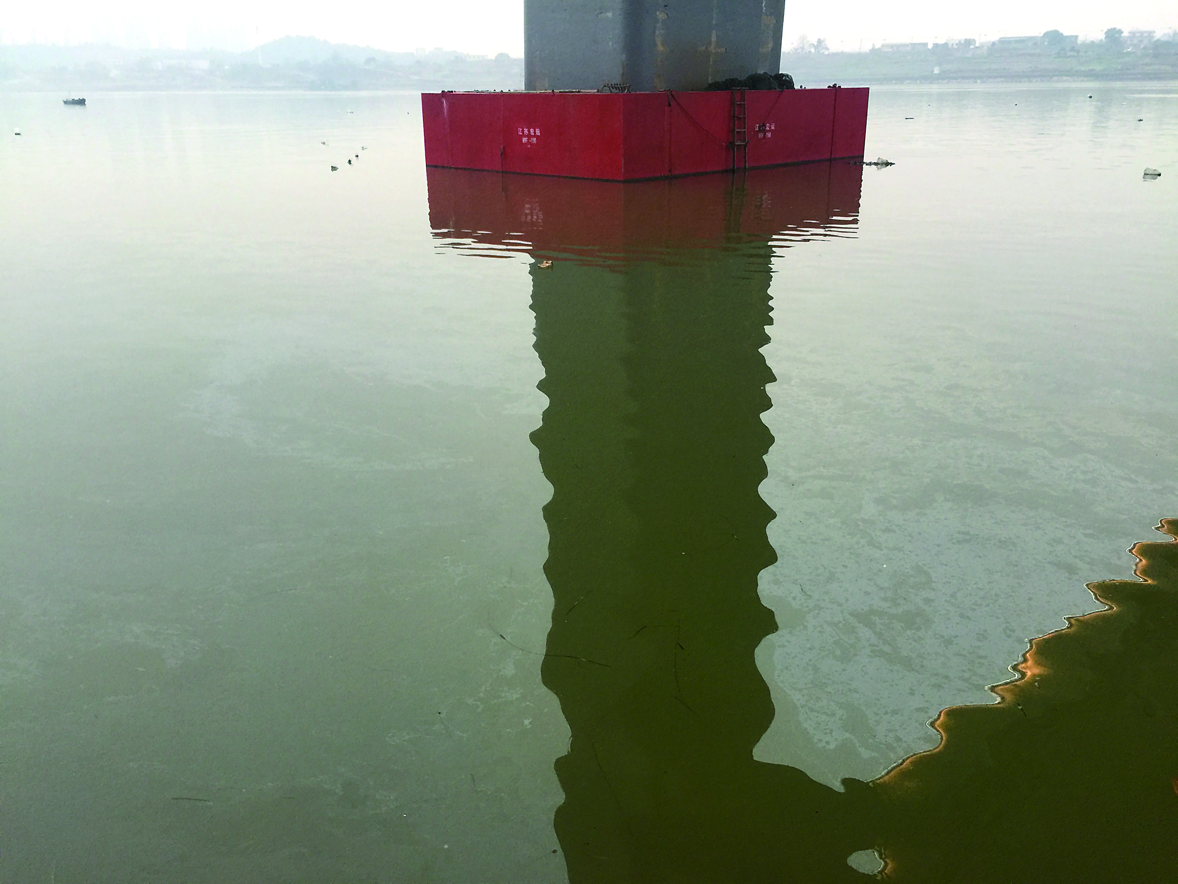 昨日上午,记者再次来到枫溪大桥西侧的桥墩下发现,油污仍未散去,油污还泛着暗红色。