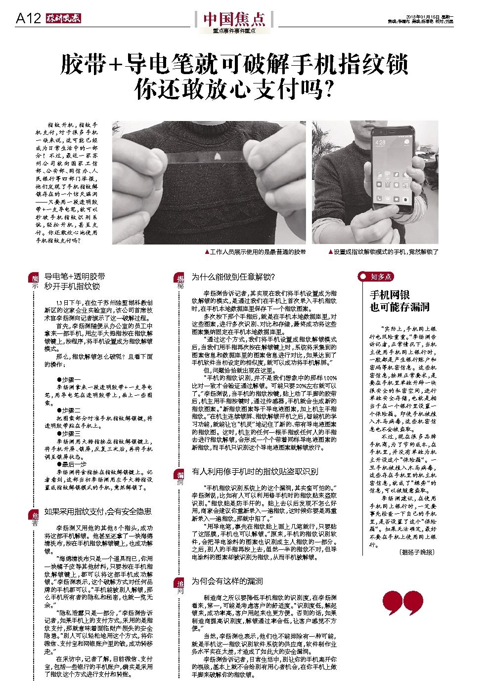 胶带+导电笔就可破解手机指纹锁 你还敢放心支付吗?