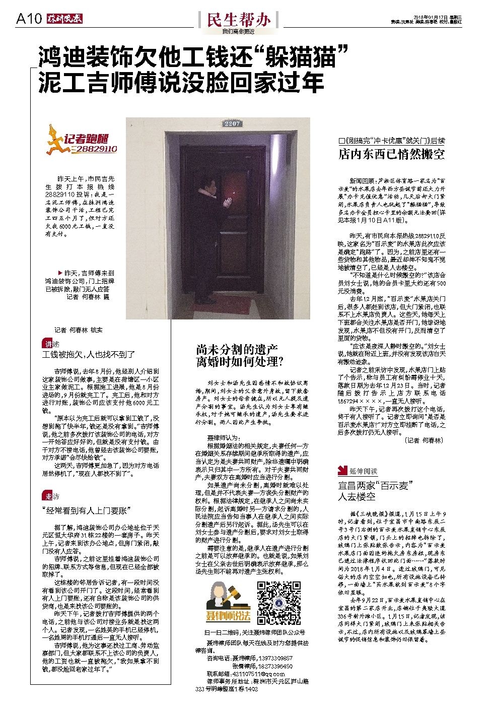 鸿迪装饰欠他工钱还“躲猫猫”泥工吉师傅说没脸回家过年