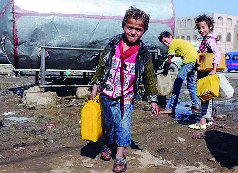 ▲2017年11月27日,也门萨那的儿童在当地人道主义机构处排队接水