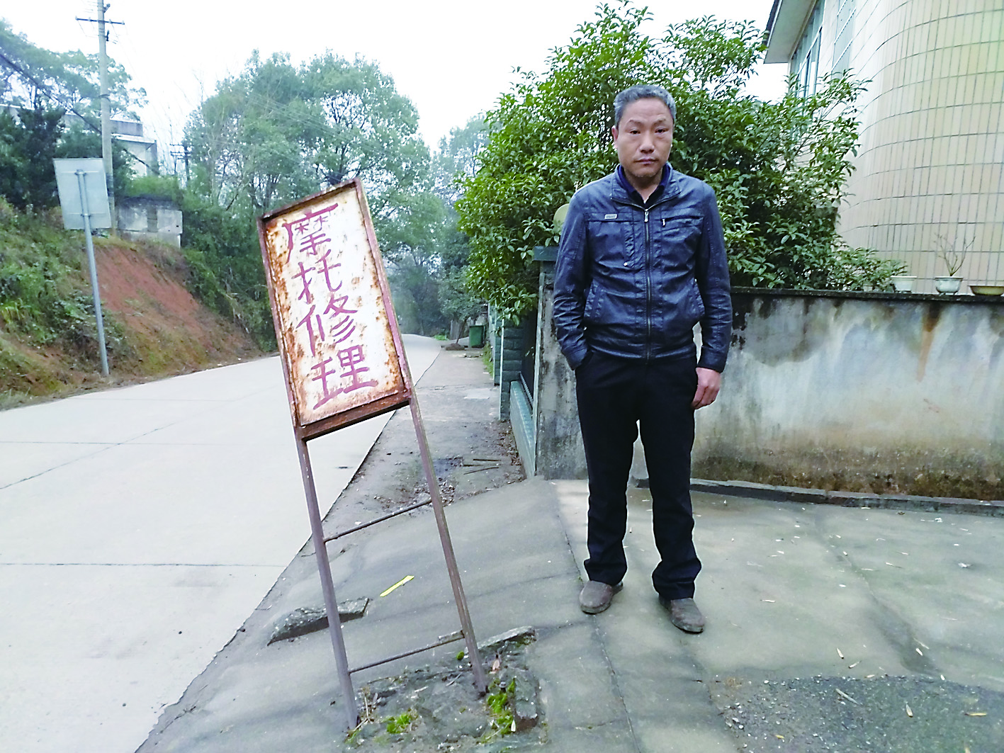 ▲刘伟患病后没法干活,修摩托车的招牌也闲置了 记者 姚时美 摄