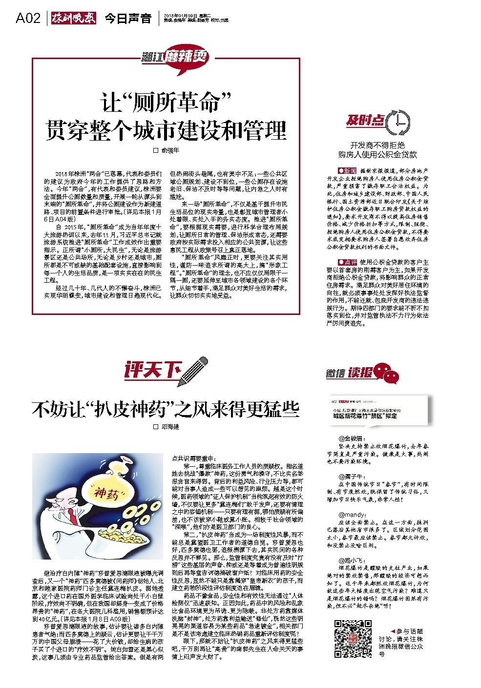 2018年株洲“两会”已落幕,代表和委员们的建议为政府今年的工作提供了思路和方法。今年“两会”,有代表和委员建议,株洲要全面提升公厕数量和质量,开展一轮从源头到末端的“厕所革命”,并将公厕建设作为新建道路、项目的前置条件进行审批。(详见本报1月6日A04版)