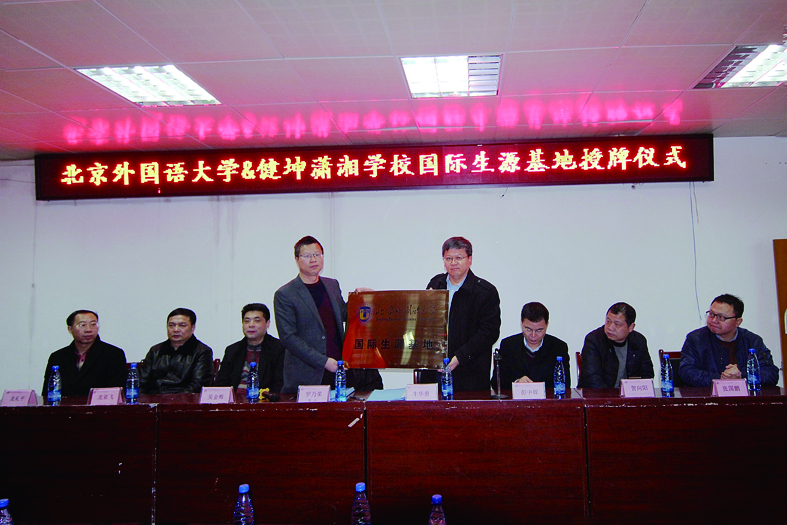 2018年1月6日,在株洲潇湘实验学校行政楼五楼,北京外国语大学“国际生源基地”授牌仪式隆重举行。北京外国语大学国际商学院院长牛华勇、株洲县教育局副局长彭中辉,株洲县教育局民办教育股股长贺向阳、健坤教育党委书记吴金辉、株洲潇湘实验学校校长罗乃荣等人出席仪式。