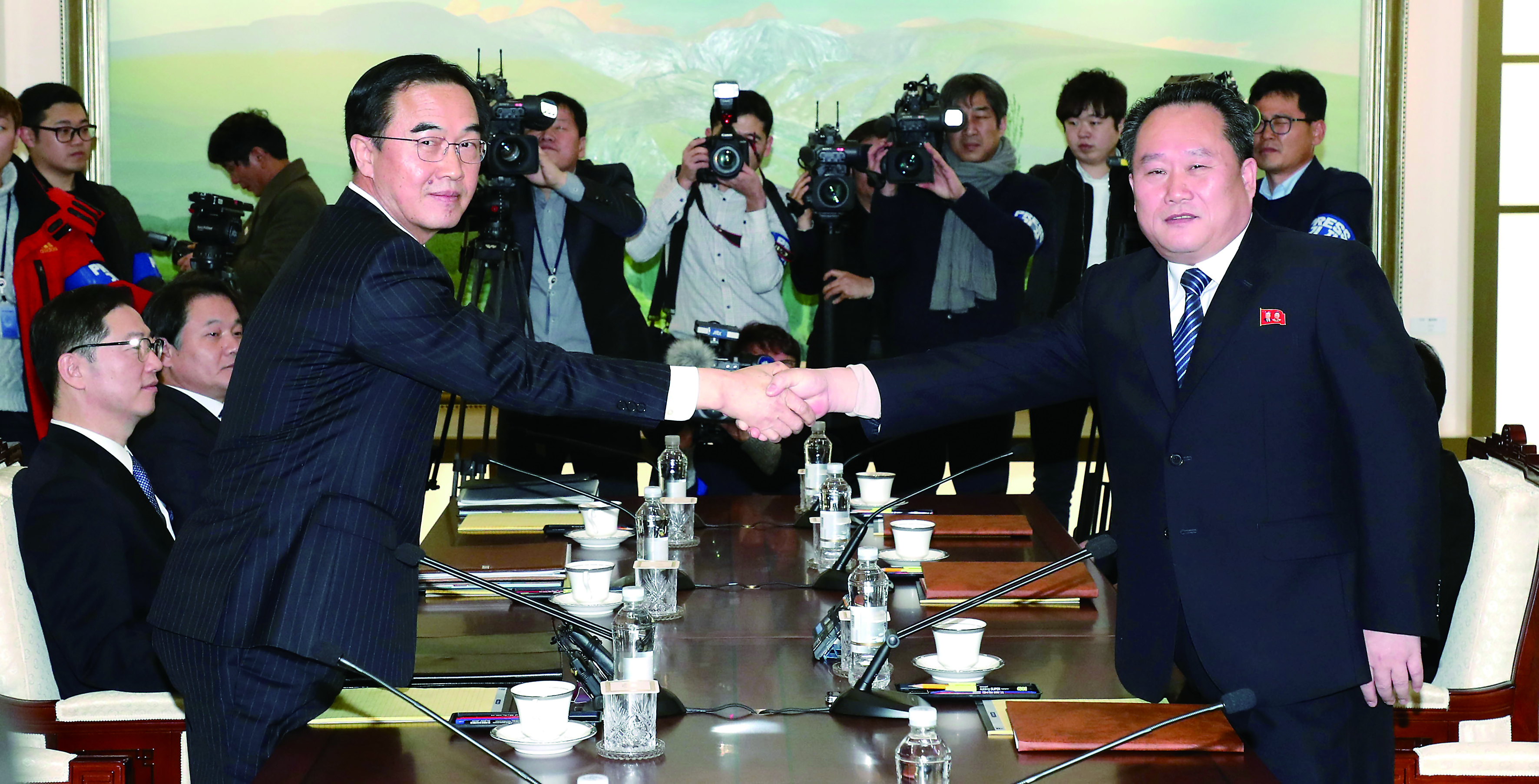 ▲1月9日,韩方代表团团长赵明均(左)和朝方代表团团长李善权在板门店韩方一侧“和平之家”握手