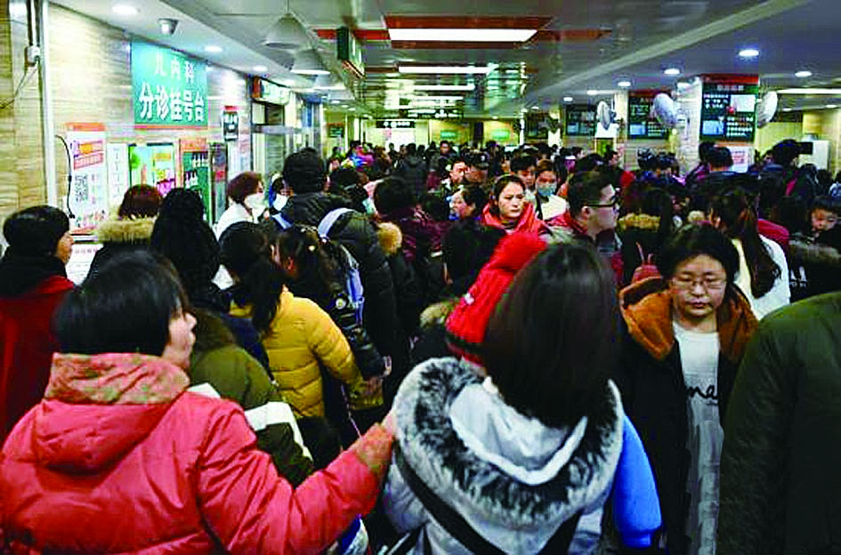 ▲1月5日,河北省儿童医院呼吸科大厅内,抱着孩童前来看病的父母们摩肩接踵