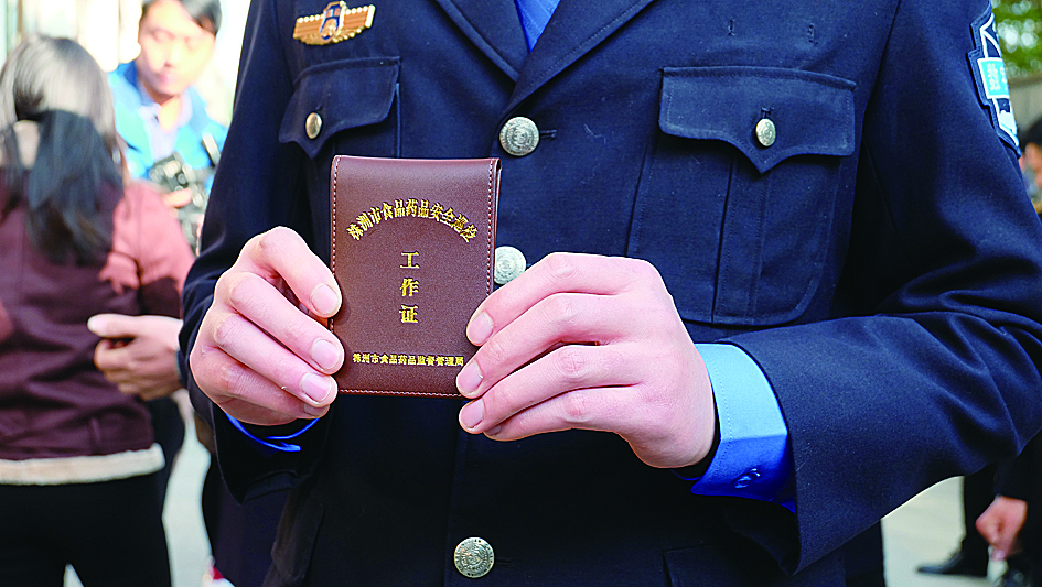▲昨日,市食药安全网格员获颁工作证 记者 贺天鸿 摄