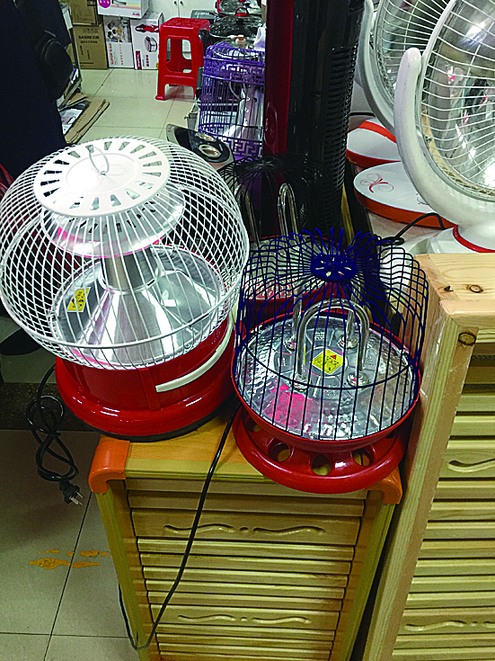昨日上午,记者跟随执法人员来到小商品市场4楼,在一家名牌电器生活馆内,执法人员发现了三个“鸟笼”式电暖器。记者看到,三个电暖器由塑料壳加几根发热管制作而成,做工粗糙,上面没有厂名厂址、生产日期、产品合格证、“CCC”认证标志等,属于典型的三无产品。