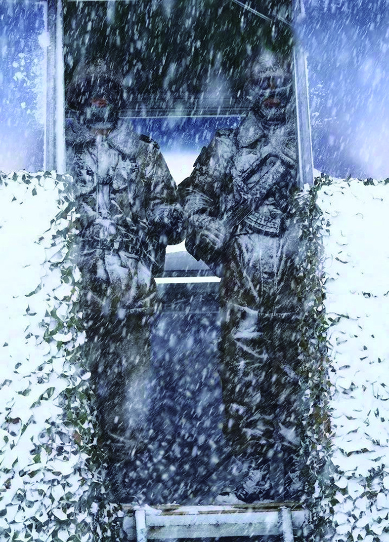 2017年12月6日,海拔4700米的边防哨点,守卫雪域高原国门边关的西藏军区某部官兵好像挺立着的“两棵松”。