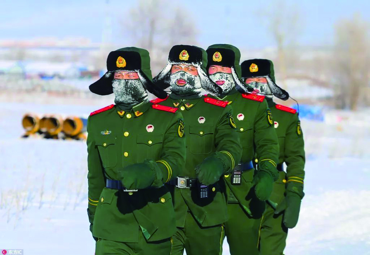 1月4日,武警呼伦贝尔市森林支队官兵冒着高寒进行野外拉练,呼出的热气迅速凝结成洁白的冰霜粘附在面罩上。