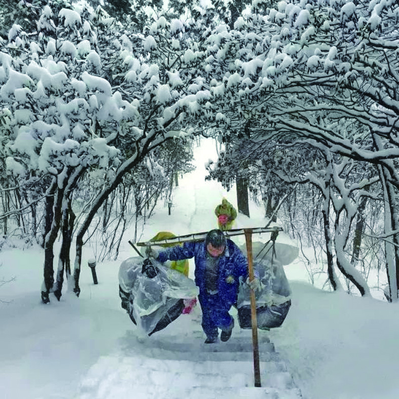 大雪纷飞,黄山一位挑山工担着重重的行李,在山路上艰难地行走着。