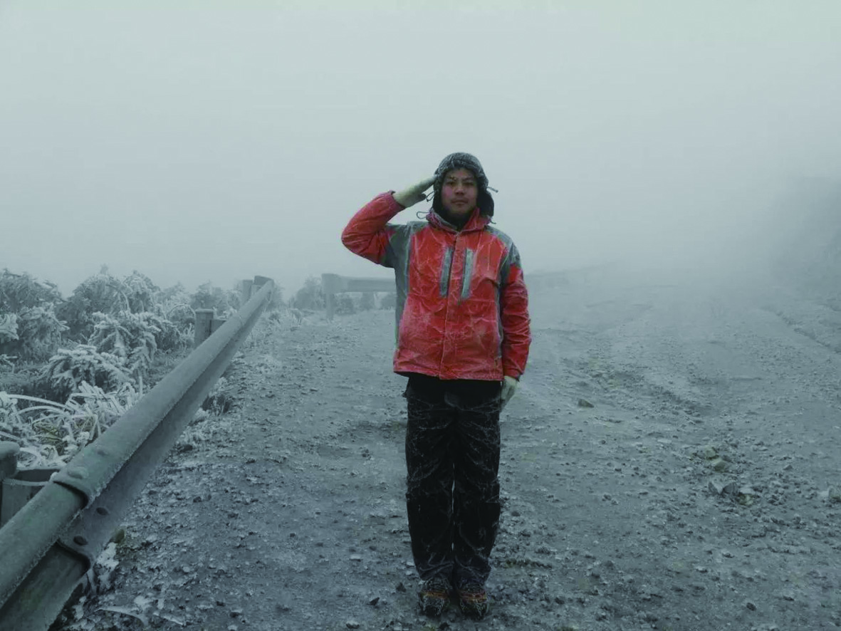 1月8日,冒着严寒和7级大风,衡阳供电公司输电运检室员工谌云飞,在海拔1260米的冰情监测哨所监测线路覆冰情况。谌云飞是名退役军人。风雪中,他给记者敬了一个军礼。