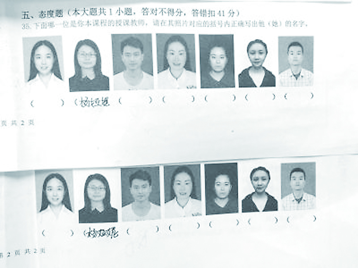 这道“选出你本课程的授课教师,请在其照片对应括号内正确写出名字”的题目,不仅让一些学生一脸懵,而且一经网络发布后也引发网友围观。题目新颖,而且答对不得分,答错却扣41分的评分标准,也让大家惊呼“答错了那可是送命”。