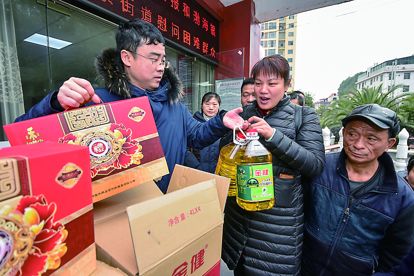 ▲昨日,渤海银行株洲分行工作人员为特困群众送年货 记者 刘震 摄