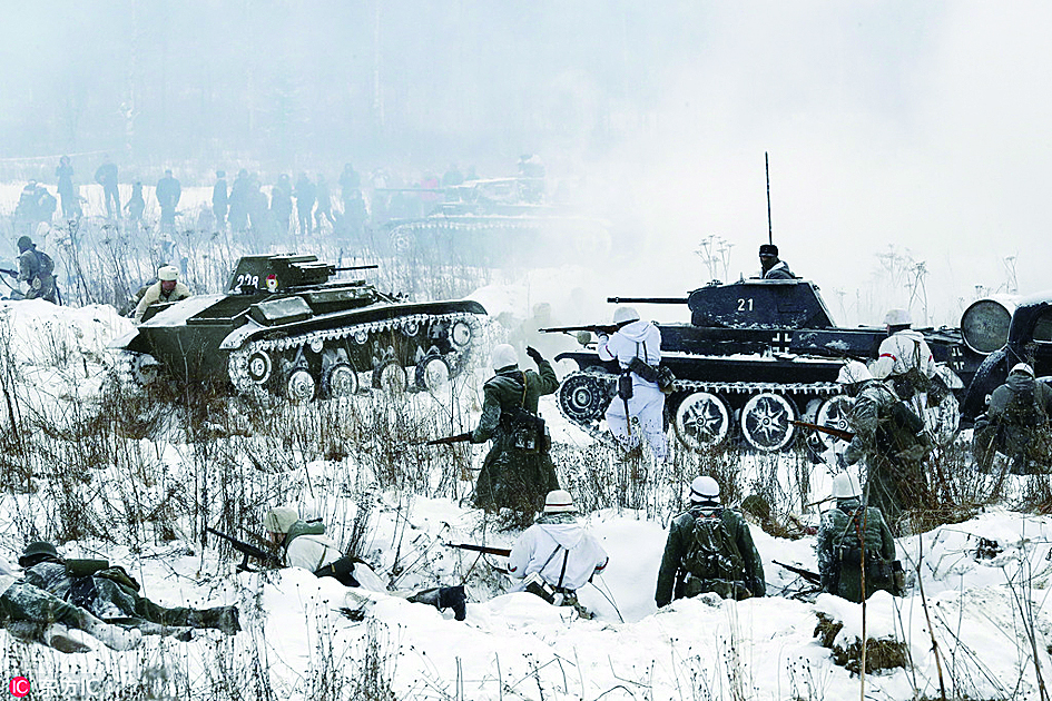 二战“重演” 为纪念二战大反攻75周年,1月21日,俄罗斯民众在圣彼得堡郊外装扮成苏联士兵与德国纳粹士兵,重演二战历史情景。 圣彼得堡旧称列宁格勒,二战时期苏军和纳粹德国在这里进行了艰苦的战役。德军从1941年9月9日开始至1944年1月27日为止共围城千余日,导致高达十五万士兵和平民死亡。 (据人民网)