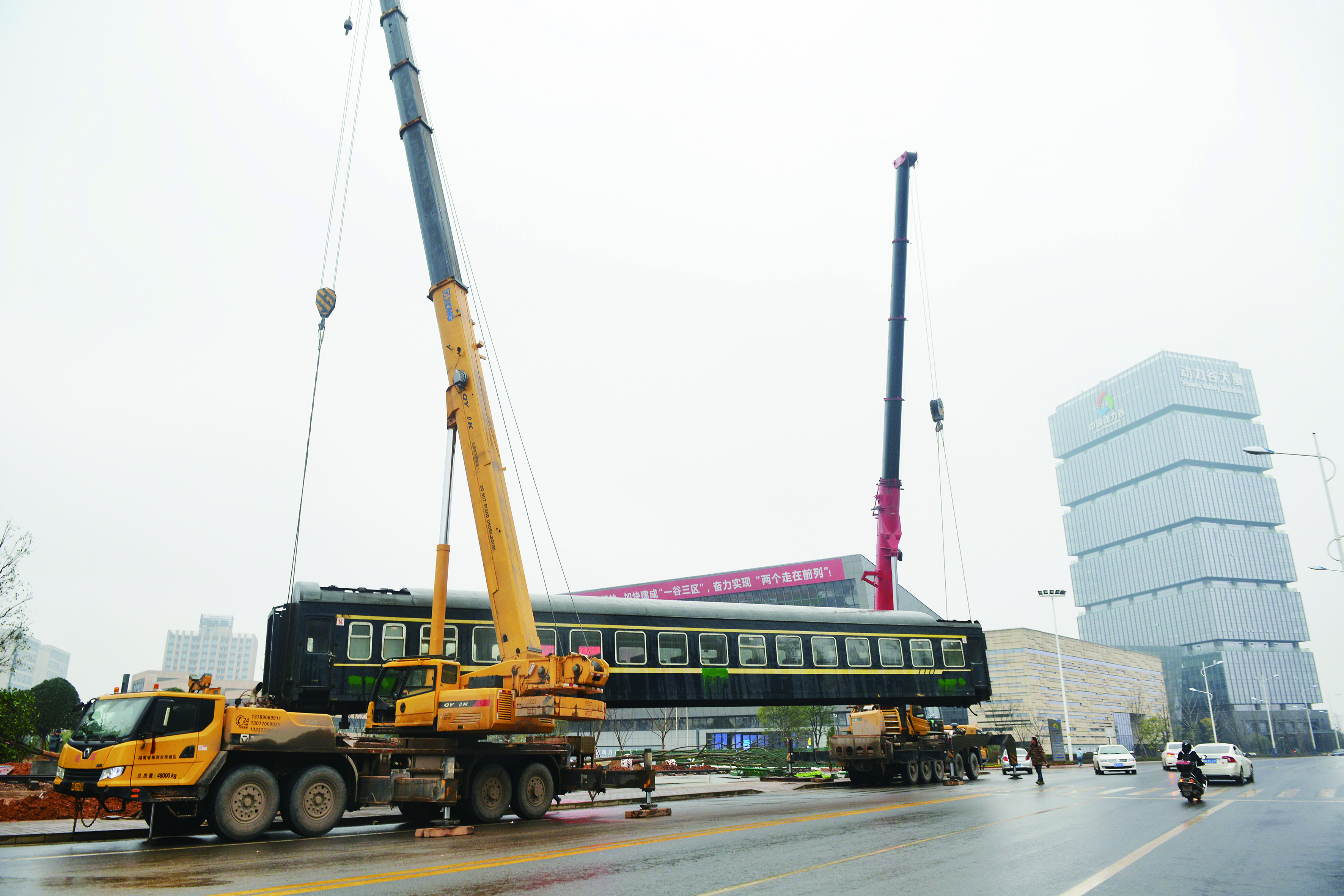 1月24日上午,在株洲·中国动力谷自主创新园,两辆吊车正吊起一节绿皮火车厢,在机车广场上安装。现场工作人员介绍,从去年10月开始,动力谷展示中心对面的机车广场启动建设,将设置机车景观,整个工程预计春节前完成。