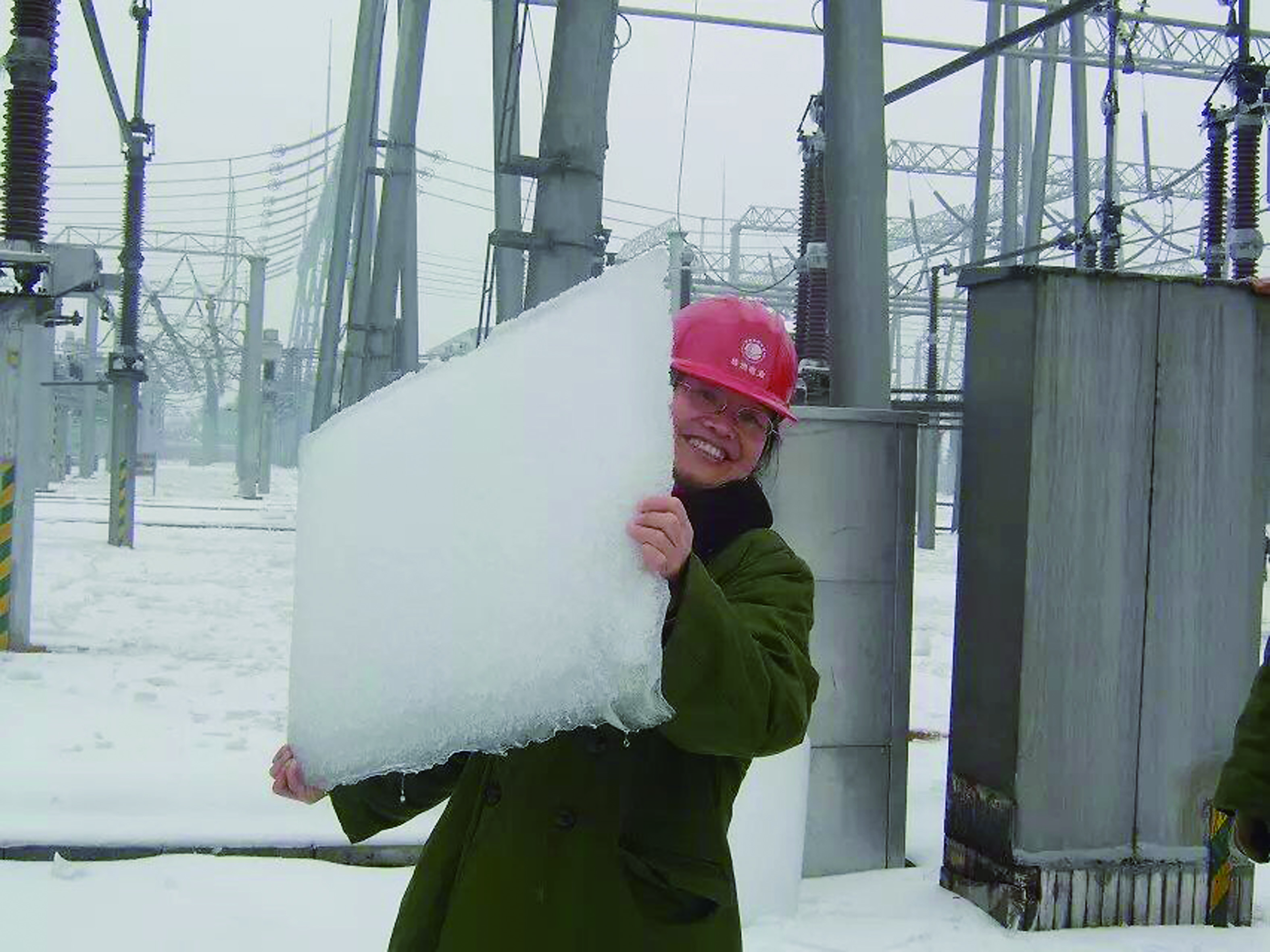 ▲2008年2月,黎晓兰在云田变电站搬下一块冰(资料图)