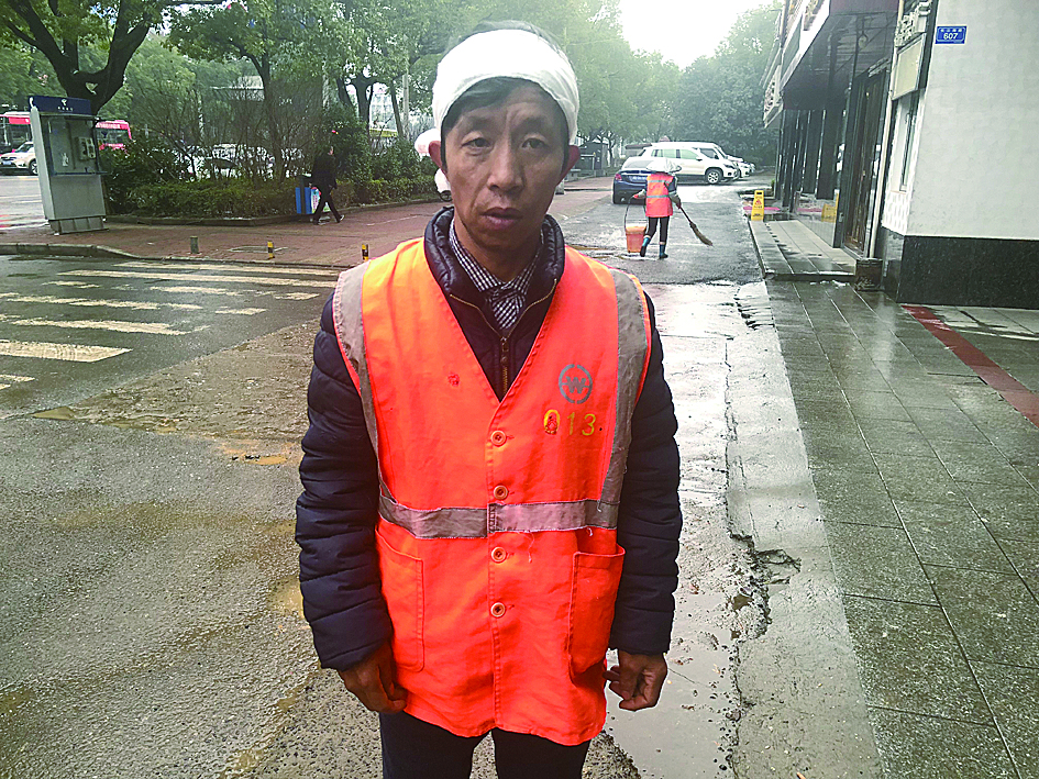 “这几天事多人少,我没问题,不回去。”张国文摆摆手说,他穿着环卫工作服,里面是一件薄羽绒棉衣,头上缠着厚厚的纱布。