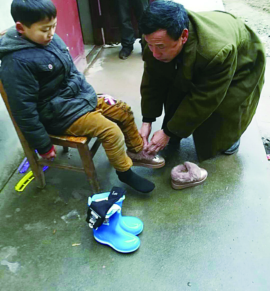 小宇鑫家是村里的贫困户,母亲离家出走多年,家里只有年老多病的爷爷和风湿病缠身的父亲。两位校长想赶紧给孩子换上温暖的鞋袜。可学校周边也没有商店,两人驱车去了距校10公里的渌口,为小宇鑫买了一双雨鞋、一双棉鞋和两双袜子,让他换上。