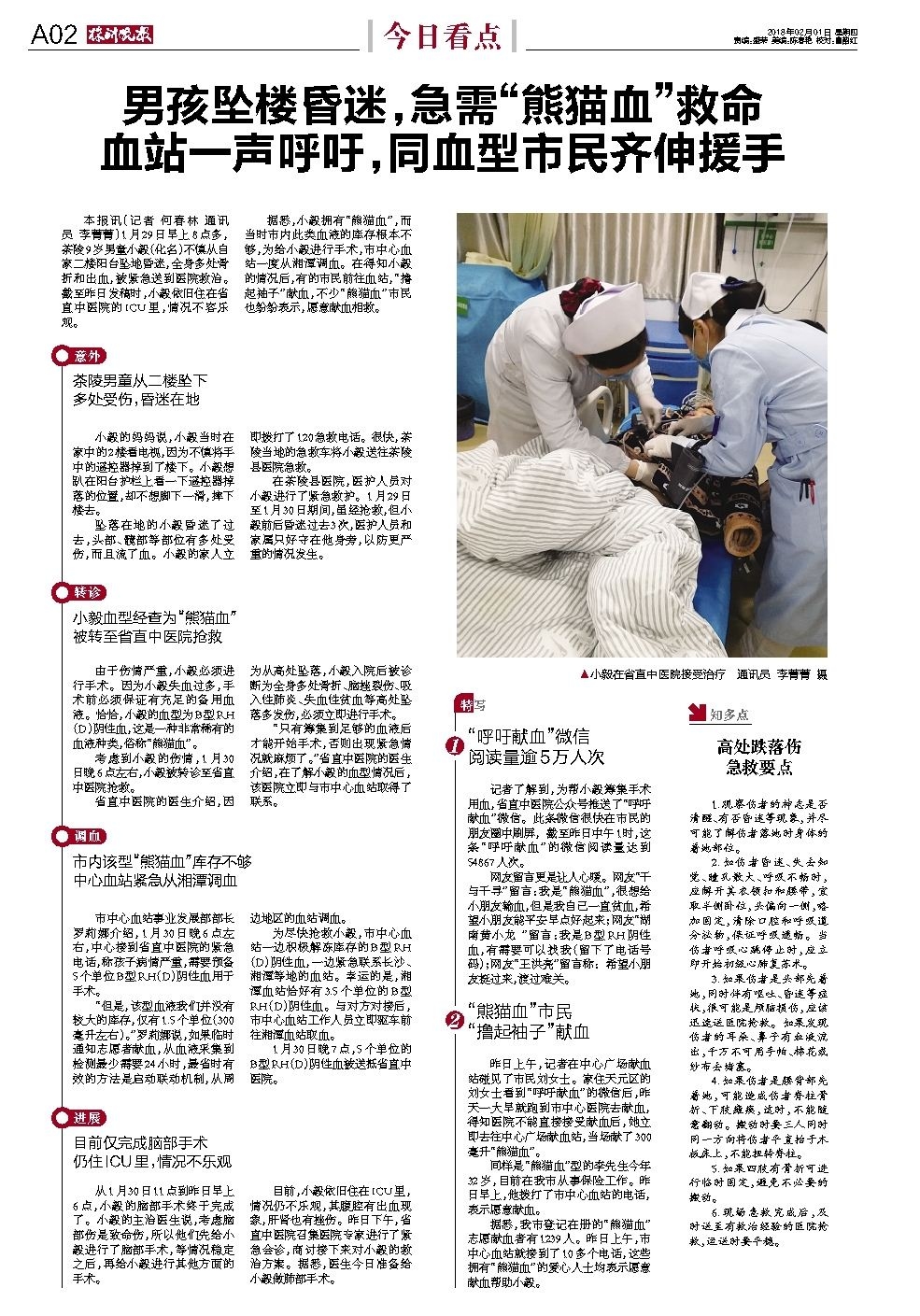 男孩坠楼昏迷,急需“熊猫血”救命 血站一声呼吁,同血型市民齐伸援手