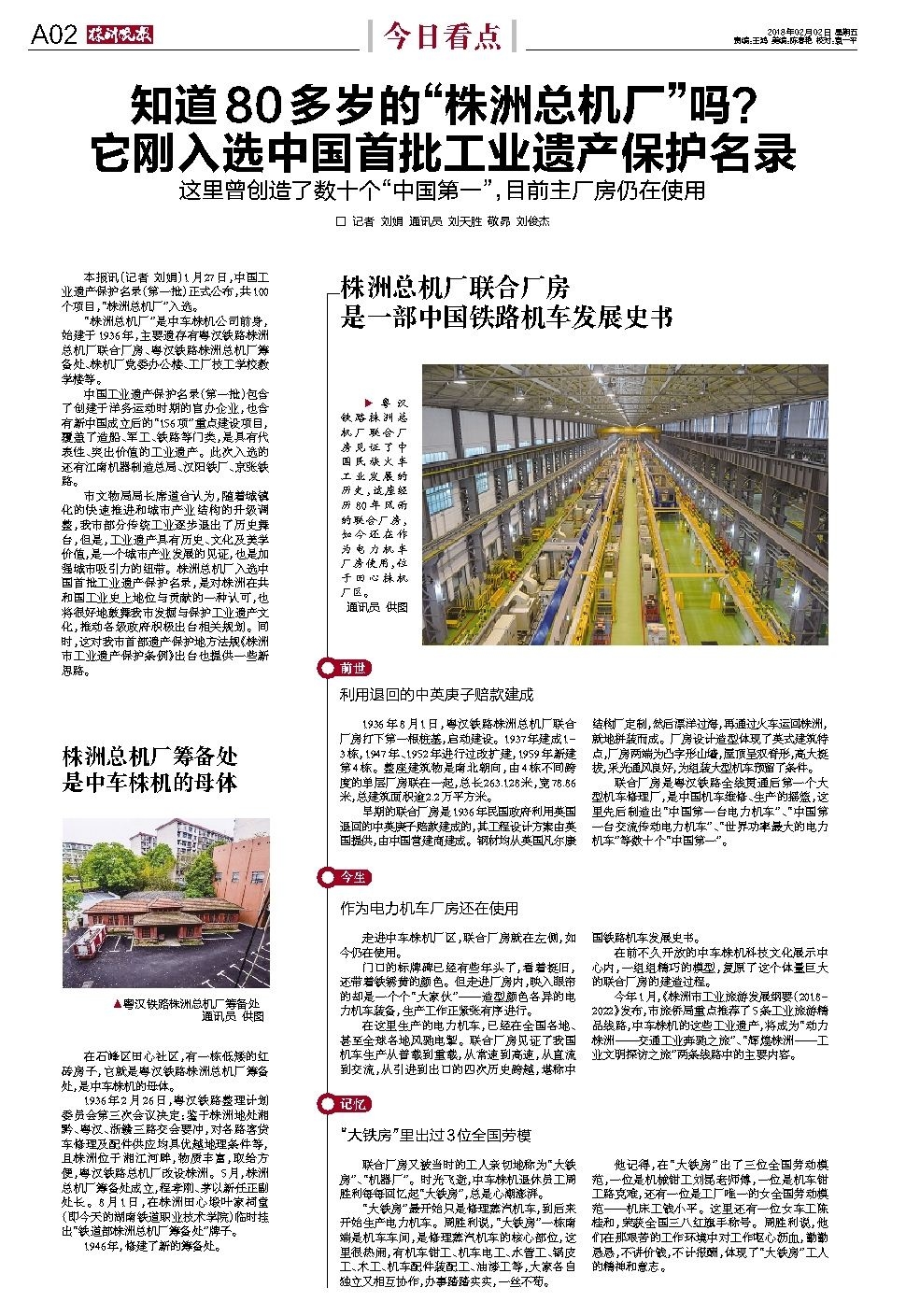 本报讯(记者 刘娟)1月27日,中国工业遗产保护名录(第一批)正式公布,共100个项目,“株洲总机厂”入选。