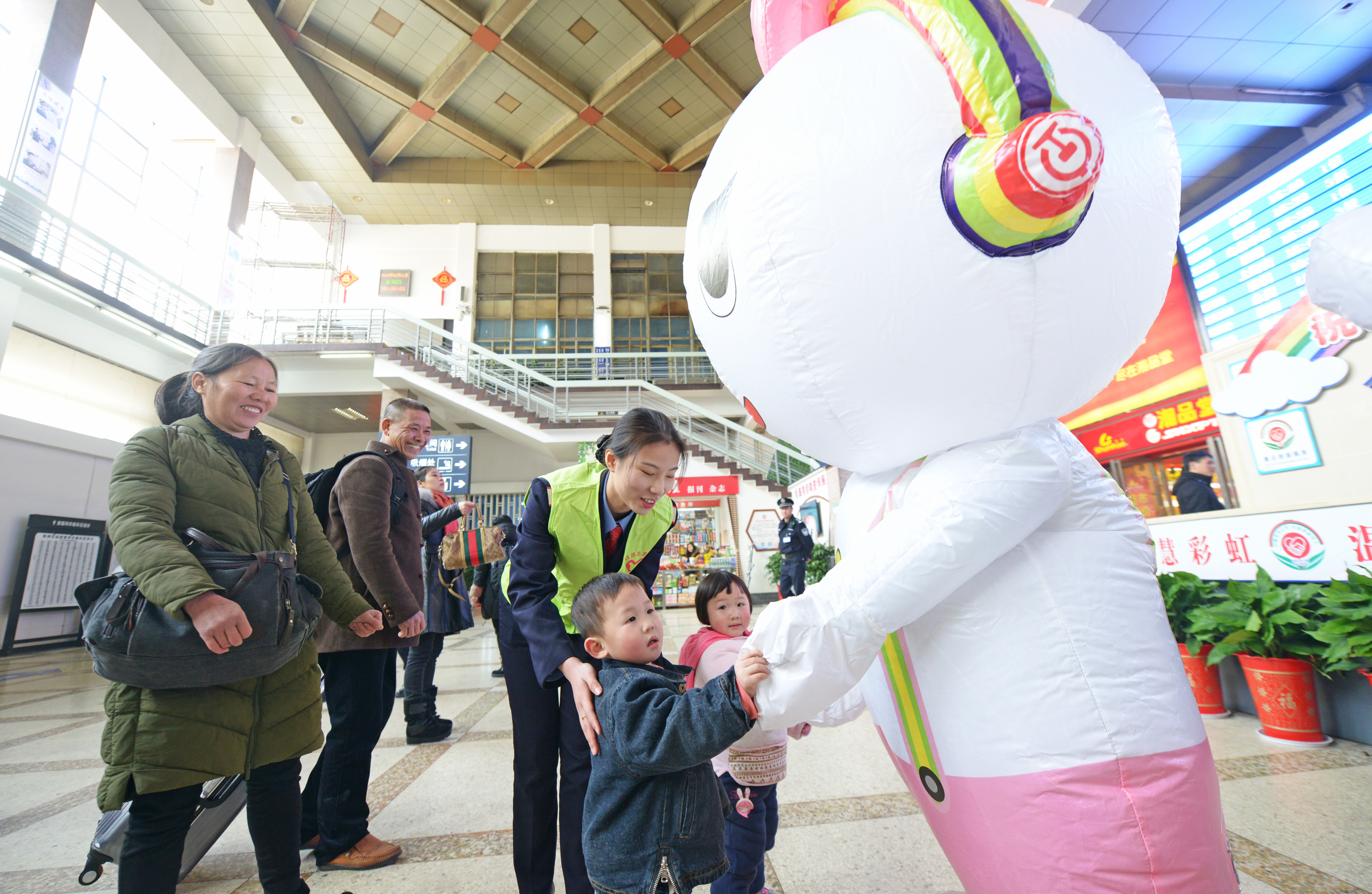 ▲株洲火车站内,彩虹服务中心的吉祥物在与小旅客互动
