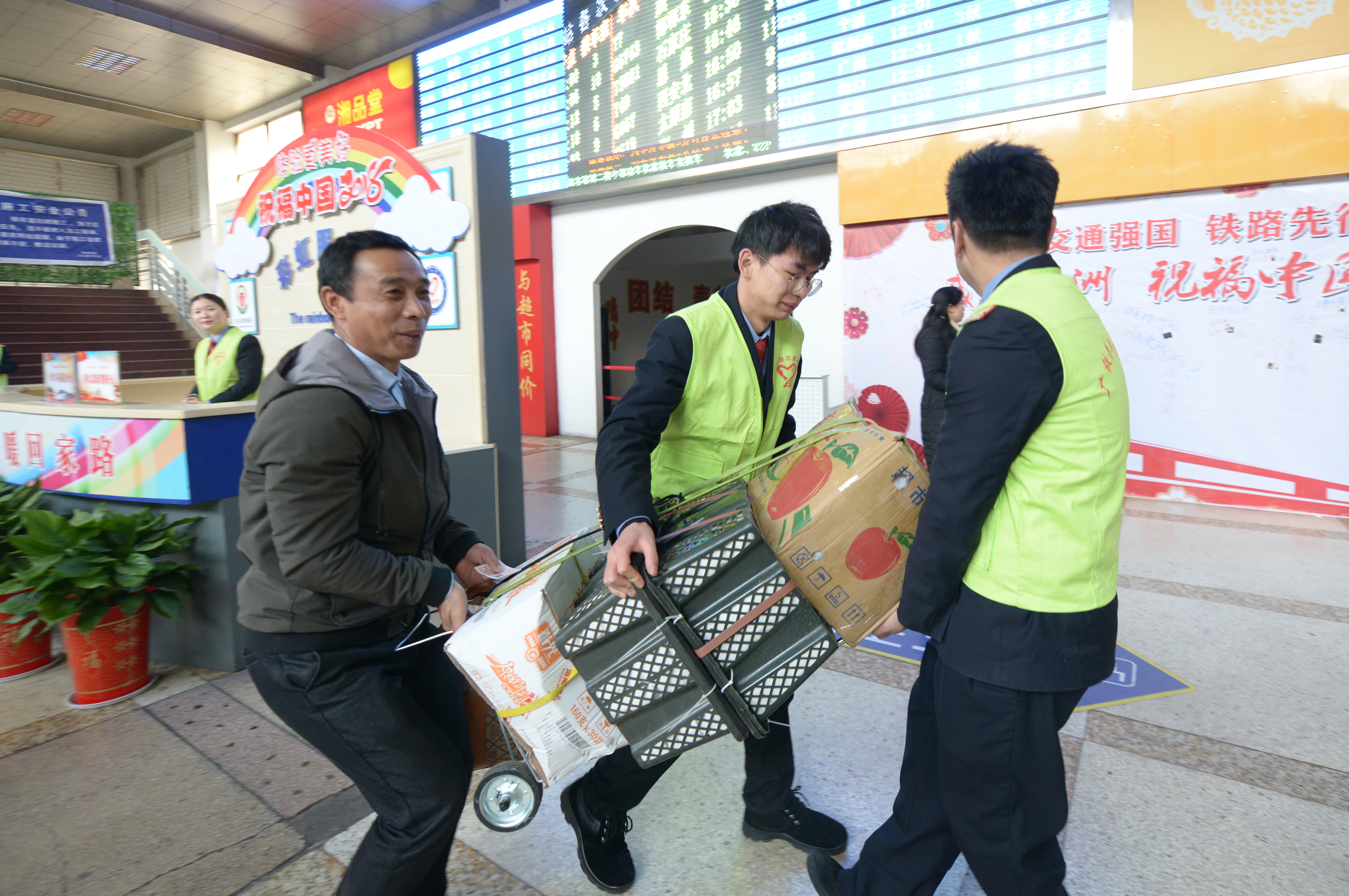 ▲株洲火车站志愿者在帮助旅客帮运行李 记者 谭浩瀚 摄