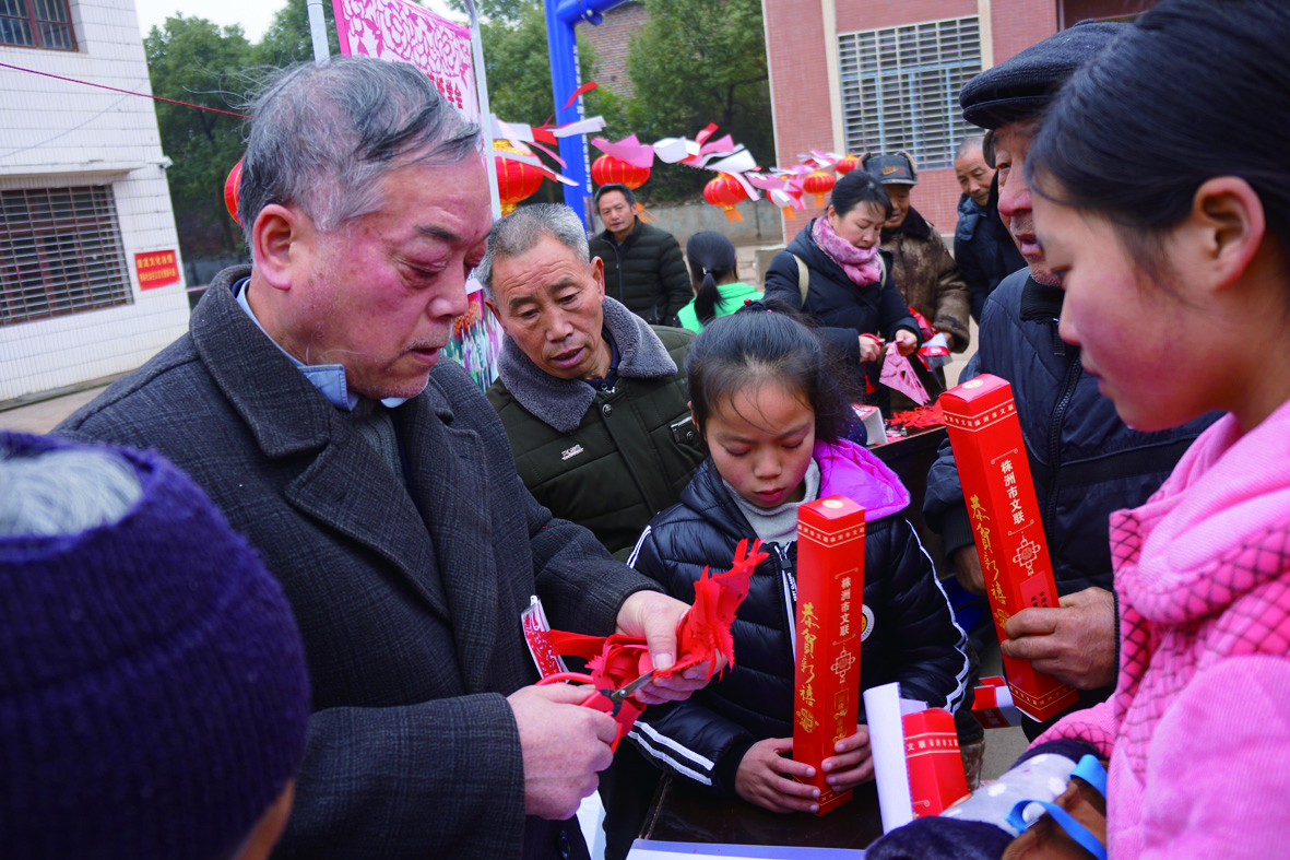 攸县桃水镇小集村是市文联帮扶的贫困村。简短的启动仪式后,300多副对联,5分钟内被村民领取一空。现场的书法家不得不临时挥毫泼墨,再写一批春联送给村民。市民协的艺术家也忙碌起来,为村民剪了100余幅窗花。