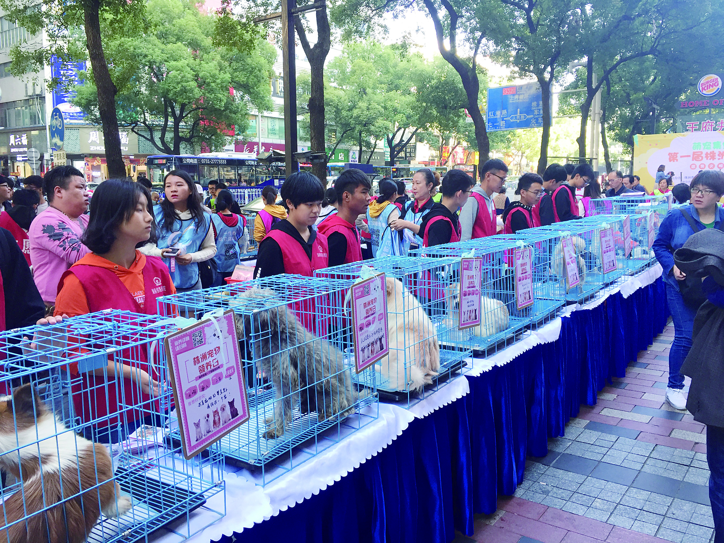 ▲活动现场,笼子里的狗狗等待新主人的领养 记者 周蒿 摄