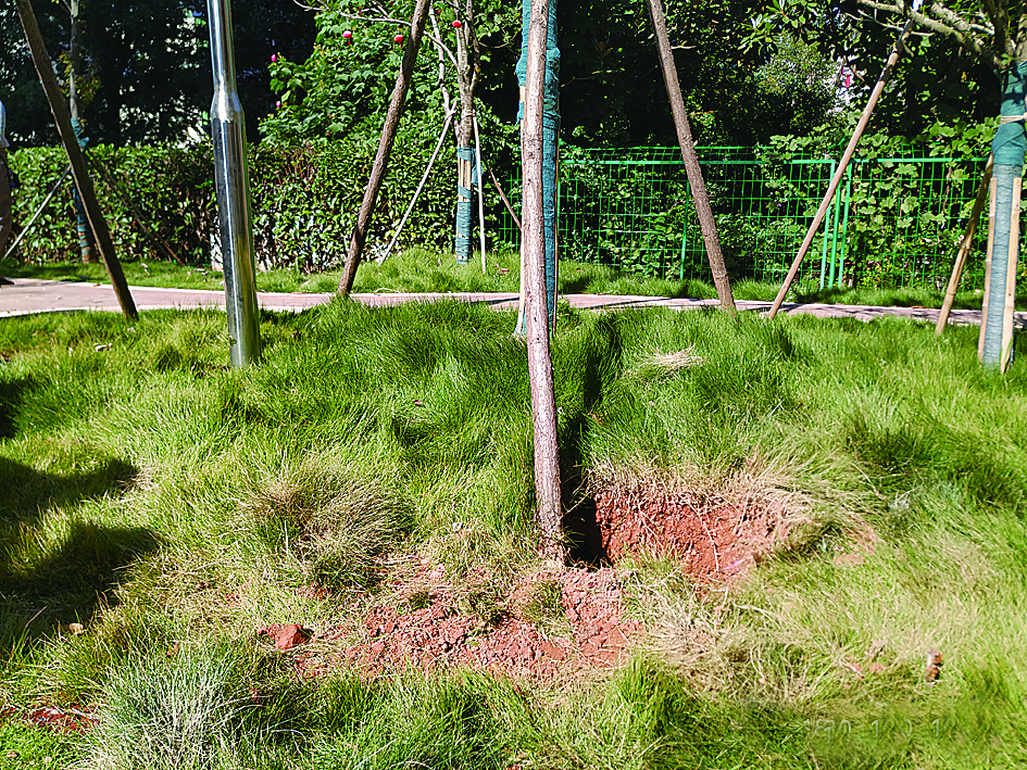 ▲草地上挖了围墙基坑,部分绿化和道路将位于围墙外 记者 姚时美 摄