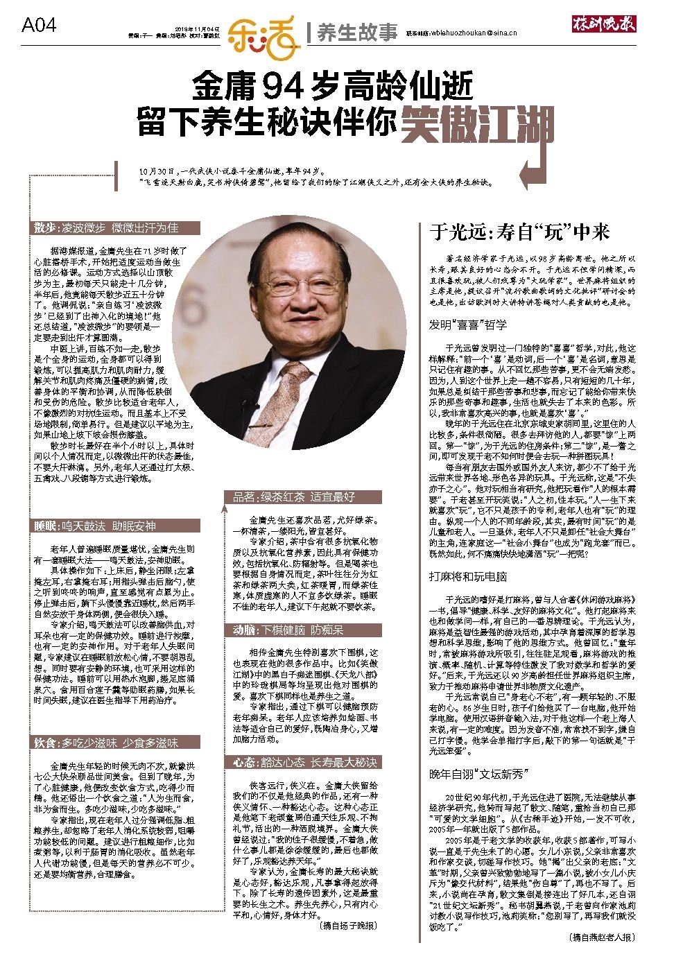 金庸94岁高龄仙逝 留下养生秘诀伴你