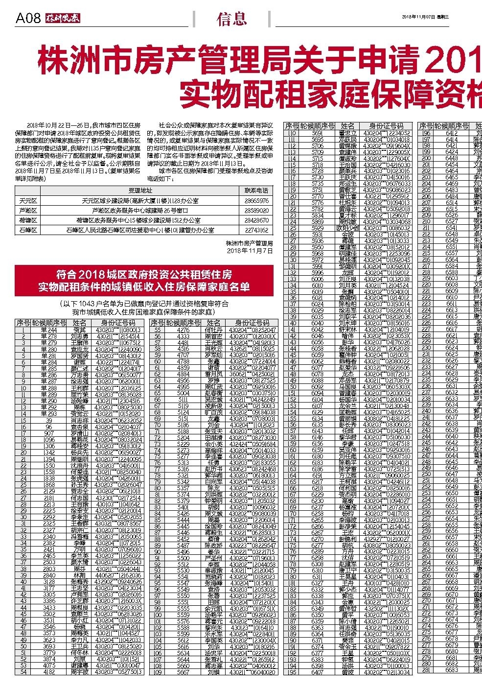 株洲市房产管理局关于申请2018年城区政府投资公共租赁住房 实物配租家庭保障资格复审结果名单的公示
